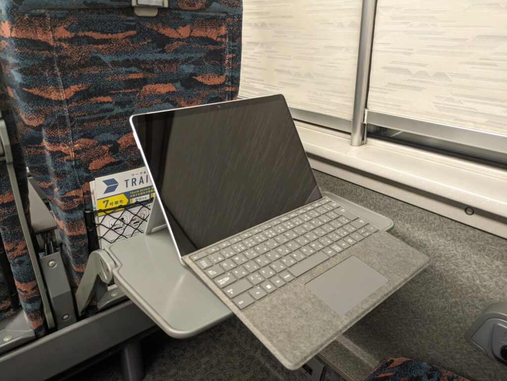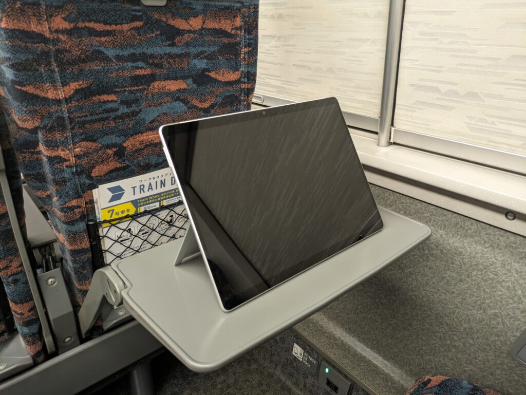 新幹線を使用した際のサイズ感です。タイプカバーを使用した場合、少し窮屈で、台からはみ出ますが、何とか使用できます。長時間の作業は難しいかもしれません。膝の上での使用も可能です。タイプカバーを外した状態だとブライジング、動画の視聴、電子書籍の閲覧に最適です。